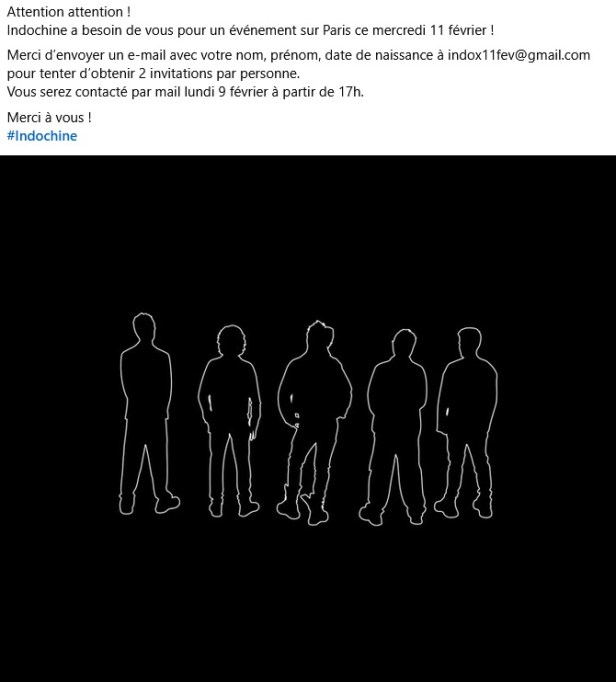 Bonjour. Voici plus de 10 ans, le groupe Indochine ont fait un concert au cube. Pourraient-ils recommencer rien que pour. Ce sera peut-être la dernière chance de les voir en vrai. Surtout Nicola