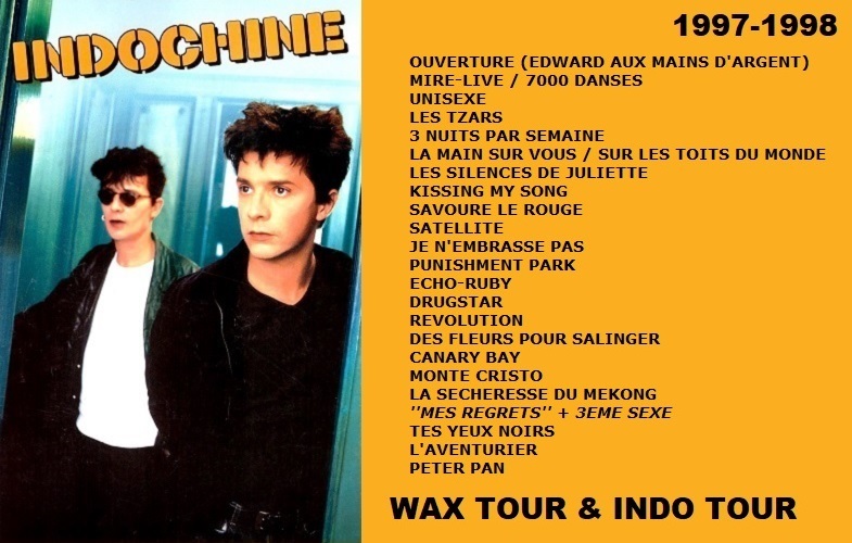 Cette chronique couvre deux des tournées les plus méconnues d’Indochine. Faisant suite à la sortie de Wax fin 1996, le prosaïquement nommé Wax Tour oscille entre la France et la Belgique pour des concerts sans cesse rajeunis et débordants de fougue. De la décennie du doute c’est peut-être la période la plus importante du groupe, celle constituant l’Acte II où Indo revit à travers de nouvelles idées, de toute façon nécessaires après le départ de Dominik Nicolas deux ans plus tôt et laissant derrière lui un duo que l’on aurait pu penser exsangue. C’est sans compter sur l’énergie des frères Sirkis qui rebondissent, armés d’une créativité florissante et celle des nouveaux musiciens qui viennent se greffer à l’aventure pour l’élaboration de Wax, et surtout à travers la vie de scène qui en dépit des faibles ventes de l’album attisent un public toujours plus jeune et fidèle. Voilà comment Indo survit, là où dans le tumulte des courants musicaux changeants de cette décennie, un groupe français vieux de quinze ans porte l’étendard du pop-rock britannique sur la scène francophone.