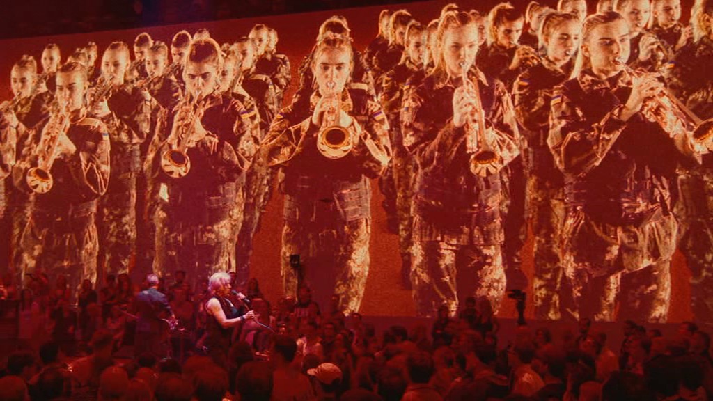 On continue avec le non moins vigoureux Sanna sur la Croix et ses accords de piano entêtants, du pur Nicola dans l’âme, presque trop pour les fans un peu usés par la formule. Pourtant, celle-ci marche plus que jamais ici, avec un excellent rendu sur le rythme et les synthés, calibrant le tout à la perfection. Vient ensuite La Belle et la Bête qui, bien avant que l’on sache que ce serait le prochain single, surprenait et interpellait déjà pour son orientation musicale qui sort des sentiers battus. Tout en étant du pur Indochine malgré tout, dans sa créativité et son originalité, comme en témoigne les vidéos de primates jouant des cuivres sur les écrans. C’est aussi le seul morceau à bénéficier d’un outro totalement inédit, où de brefs coups de trombones invite à taper des mains pour rentrer dans la danse. Vient alors la séquence émotion de la soirée avec Seul au Paradis, un chant funéraire déjà bien émouvant auquel Indo ajoute des chœurs masculins et un orchestre complet apparaissant en fond de vidéo, pareil à une marche en fanfare possiblement soufflée par l’Orchestre de la Garde Républicaine des précédentes tournées.